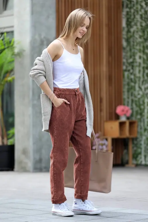 Corduroy Drawstring Cuffed Pants with Pockets 1414