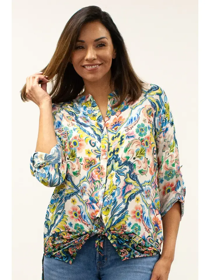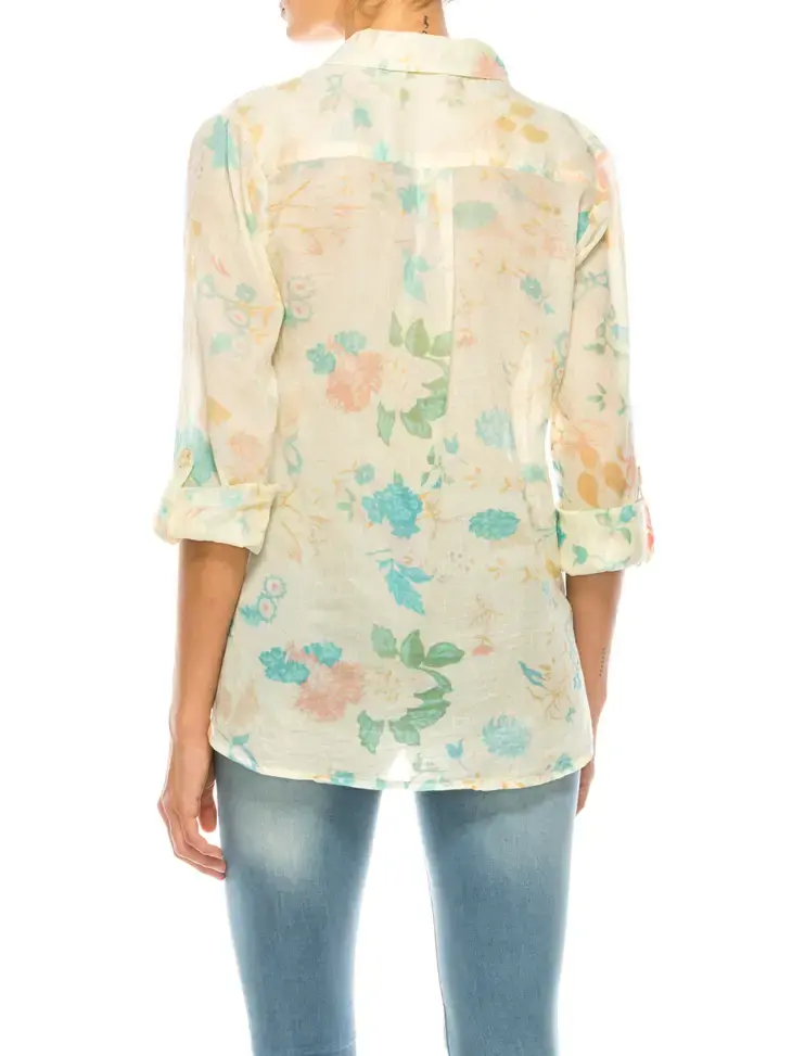 Floral Printed Button-Down Tunic with Colorful Embroidery - Fade Wash